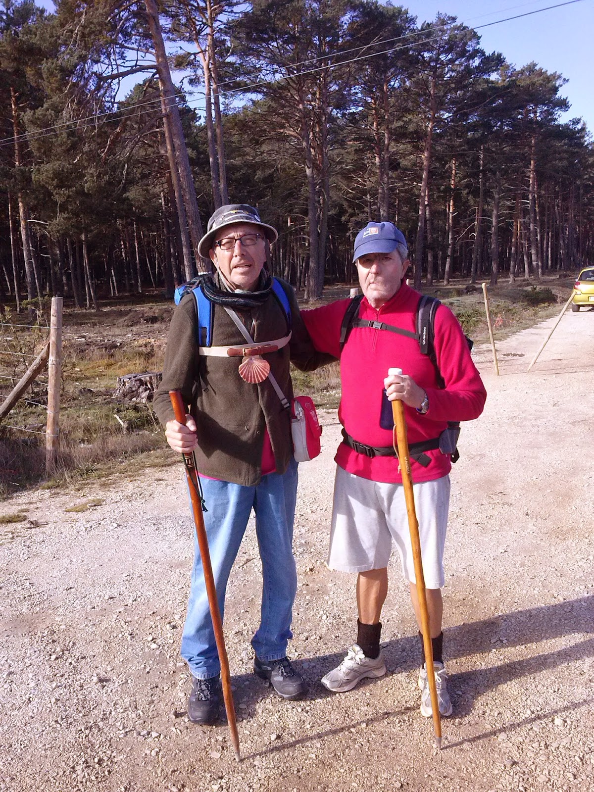 15/X/014.-Salimos dirección a Calatañazor rodeados de sabinas uno de los árboles mas resistentes a las adversidades de los climas mas frios. llegamos a la carretera de Soria a la N-1, cruzandola por un puente y giramos a la derecha siguiendo la Cañada Real Riojana hasta Venta Nueva donde comemos y descansamos, continuando de nuevo por la Cañada pasamos por la Aldeuela de Calatañazor famosa por sus chimeneas, mas adelante vemos una tablilla que nos señala la dirección a seguir y le hago una foto a Angel , estamos en el sabinar de Calatañor y una gran recta nos lleva hasta un mirador desde donde vemos el pueblo de Abejar y a lo lejos se divisa el Pico de Urbión, bajamos una pendiente cruzamos una antigua via ferrea junto a una ermita y mas adelante pasamos la carretera que va a Soria y entramos en Abejar.