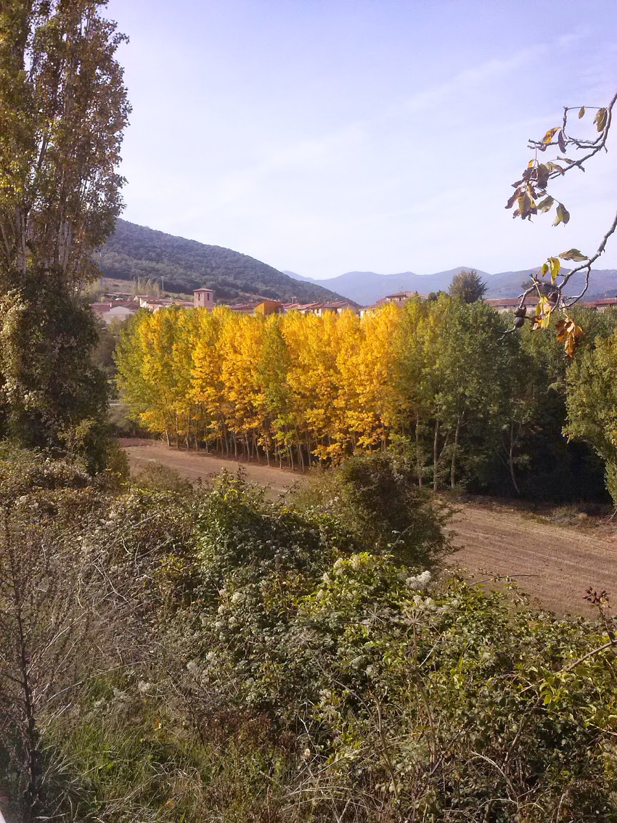 vegetación y gran cromatismo debido al otoño, unos kms. mas abajo llegamos a una rotonda donde vemos la indicación de la subida al Monasterio de la Valvanera siguiendo un arroyo de cantarinas aguas y envuelto de grandes matorrales. La subida se va haciendo cansina debido a la pendiente y a los deseos de llegar, hacemos un alto en la cruz que indicaba en la edad media que las mujeres no podían pasar al monasterio y ha partir de aquí solo falta el ultimo km..