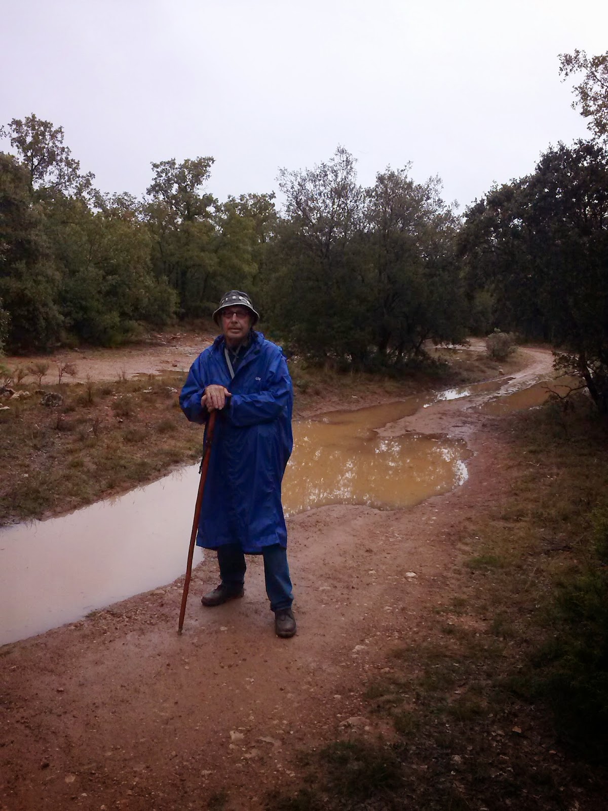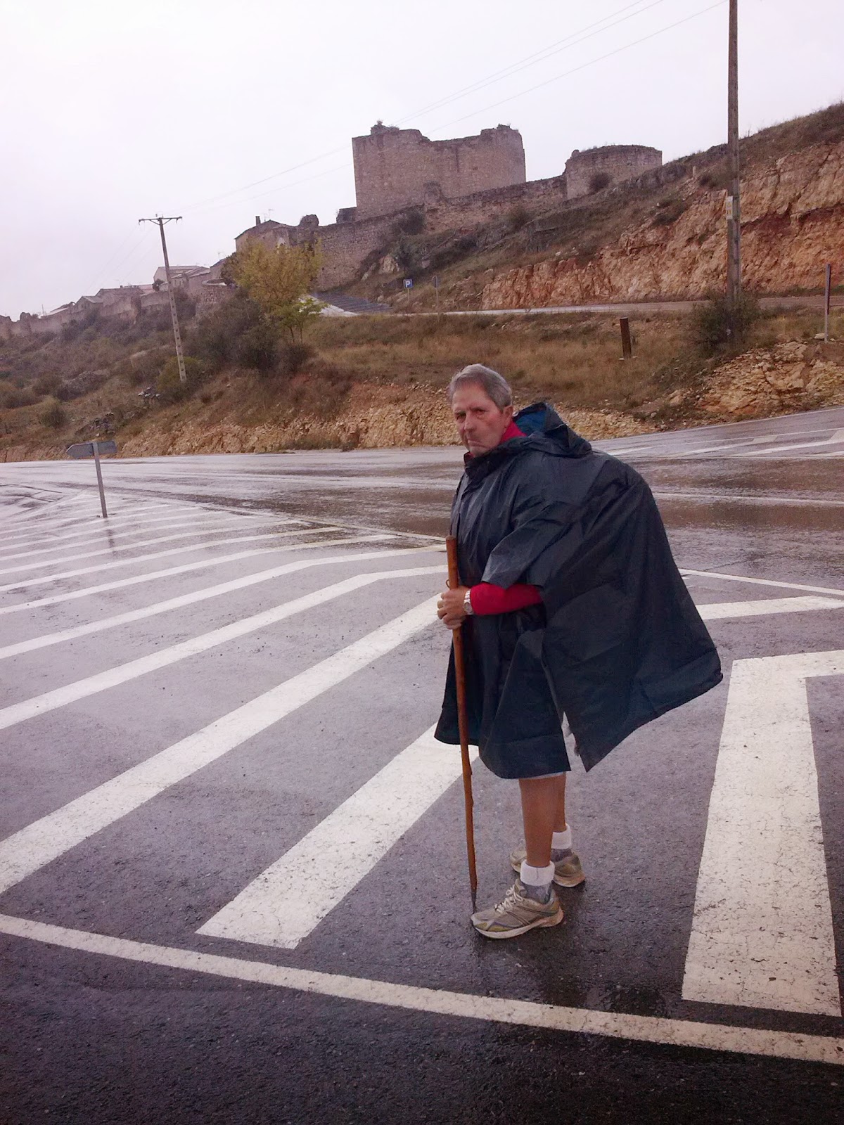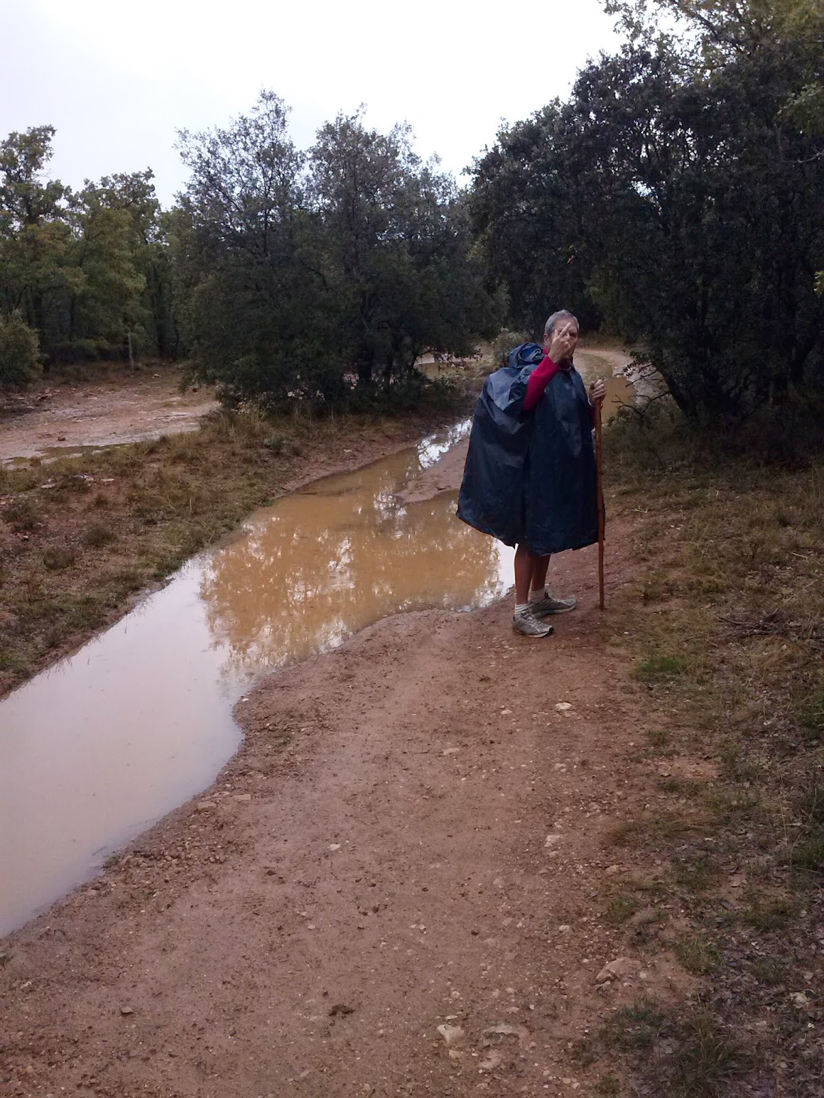 9/X/014.- Amanece lloviendo pero a los peregrinos no nos impide salir, nos colocamos nuestros impermeables pero al llegar a la ermita del Peral la lluvia es tan intensa que nos tenemos que refugiar en ella y esperar a que escampe, continuamos en busca de la Cañada Real Soriana y una vez en ella el caminar se nos hace difícil ya que el suelo está encharcado y embarrado.