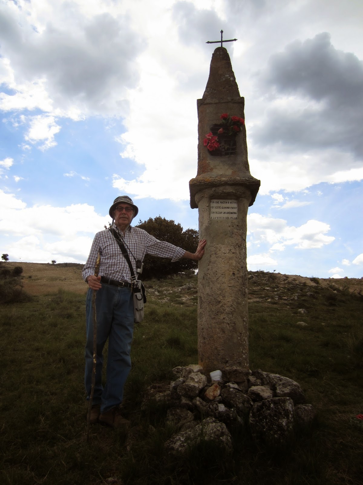 15/X/014.-Salimos dirección a Calatañazor rodeados de sabinas uno de los árboles mas resistentes a las adversidades de los climas mas frios. llegamos a la carretera de Soria a la N-1, cruzandola por un puente y giramos a la derecha siguiendo la Cañada Real Riojana hasta Venta Nueva donde comemos y descansamos, continuando de nuevo por la Cañada pasamos por la Aldeuela de Calatañazor famosa por sus chimeneas, mas adelante vemos una tablilla que nos señala la dirección a seguir y le hago una foto a Angel , estamos en el sabinar de Calatañor y una gran recta nos lleva hasta un mirador desde donde vemos el pueblo de Abejar y a lo lejos se divisa el Pico de Urbión, bajamos una pendiente cruzamos una antigua via ferrea junto a una ermita y mas adelante pasamos la carretera que va a Soria y entramos en Abejar.