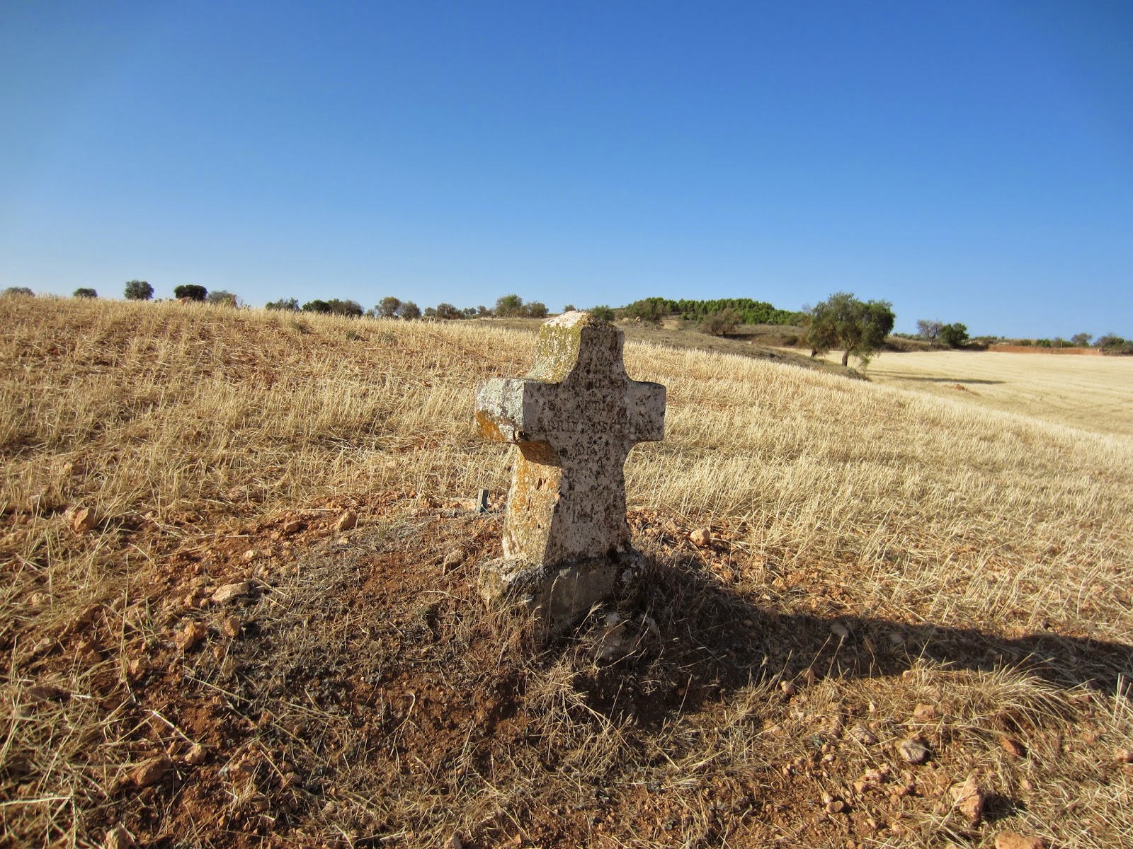 7/X/ 014.-Al la salida de Mondejar rezamos ante la ermita de San Pedro, pasando mas adelante por otra ermita que tiene en su interior una cueva con un vía crucís con figuras de tamaño natural continuamos y el camino se divide en dos, la señal indicadora no la vemos, hasta que removiendo una piedra grande aparece la flecha amarilla una vez colocada la piedra con la señal indicando el verdadero camino seguimos, mas adelante, vemos una cruz de piedra de una sola pieza que recuerda una tragedia familiar.Llegamos a la Cañada Real Soriana