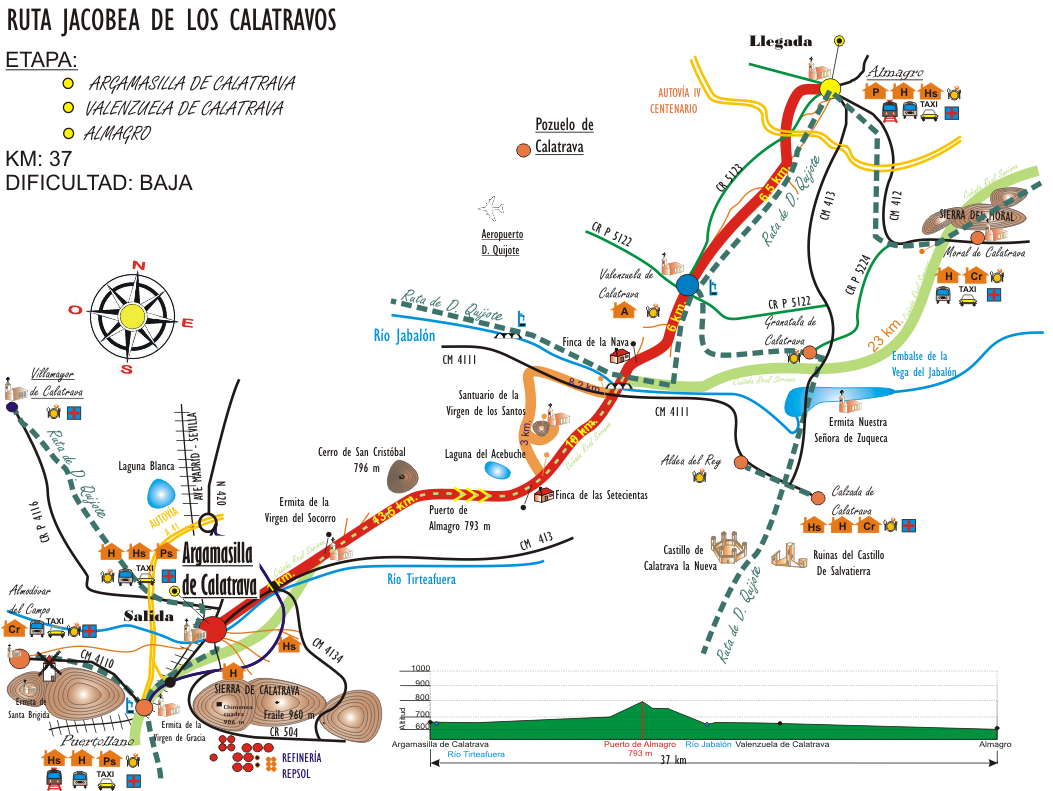 A continuación, reproducimos todos los planos de las etapas de que esta compuesta la Ruta Jacobea de los Calatravos, estos planos irán incluidos en la Guía de mano que se esta confeccionando, en esta futura Guía irán incluidos todos los datos de interés de cada etapa, las etapas son orientativas para que cada peregrino, según el medio que emplee para realizarlas, pueda hacerse una idea más detallada del recorrido, distancias, lugares de interés histórico, cultural o geográfico, sitios donde poder comer o alojarse y servicios que puede disponer por los lugares que la Ruta Jacobea de los Calatravos discurre.